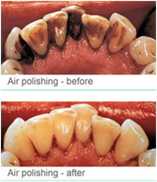 Using a combination of air, a special sodium bicarbonate powder and water spray, we can clean away all the stain and plaque painlessly with fantastic results.